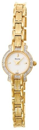 With its diamond-encrusted bezel and polished gold-tone bracelet, the Bulova Women's Diamond Case Watch #98R007 makes a fittingly dazzling accessory for your most special occasions. The bezel makes a breathtaking frame for the understated white dial, which is simply adorned with four gold-tone indices and tapered hands. The slender bracelet fastens with a jewelry clasp and brings a graceful touch to the wrist. Like every Bulova watch, this ... Read More...